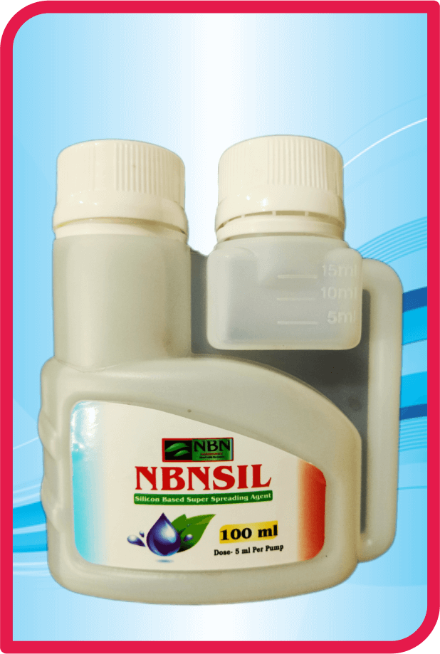 NBNSIL is a Non ionic silicon based super spreading and activated agent.Being Non-Ionic, it can be mixed with a broad spectrum of agrochemicals, nutrients and organic products. The product is based on Trisiloxane Alkoxylate and has a very high silicon purity, thereby contributing to extremely fast action and very high dosage. NBNSIL ensure a quick and enhanced super spreading of the spray solution on leaf surface and fast penetration through the cuticular layer of leaf for rapaid uptake.